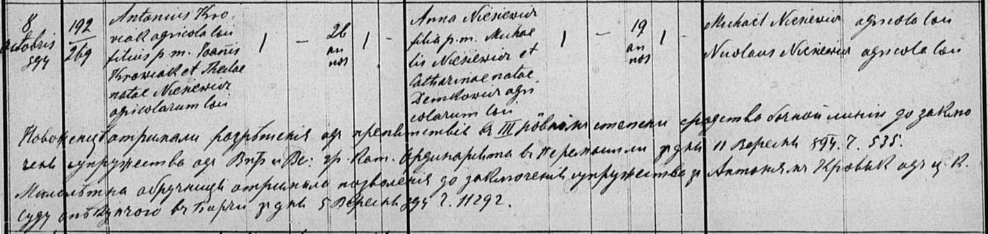 Anna Krowiak (nee Niesiewicz) marriage record to Antonius Krowiak on 8 Oct 1894