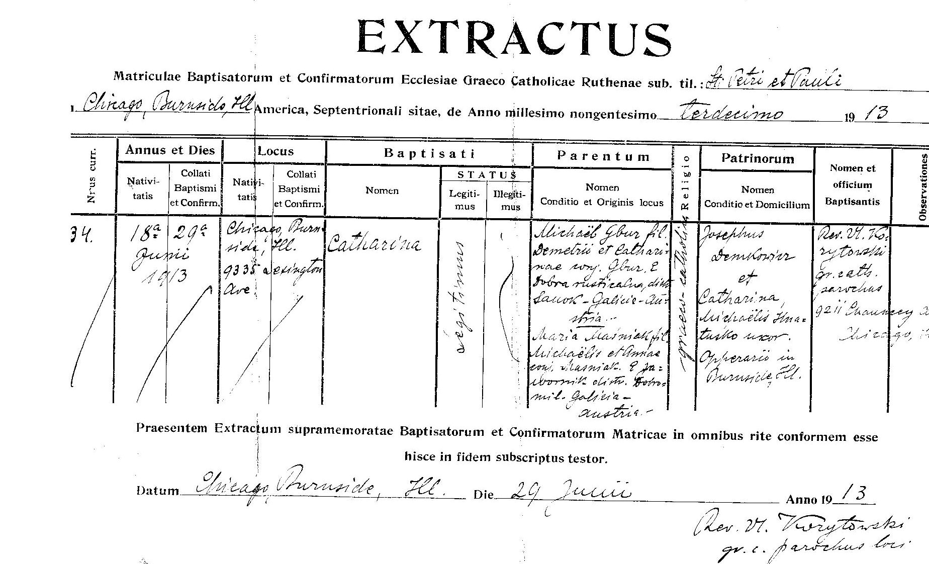 Below is a Baptismal record from the St Peter and Paul Ukrainian Orthodox Church that was located at 9211 Chauncey Ave, Burnside, Chicago IL