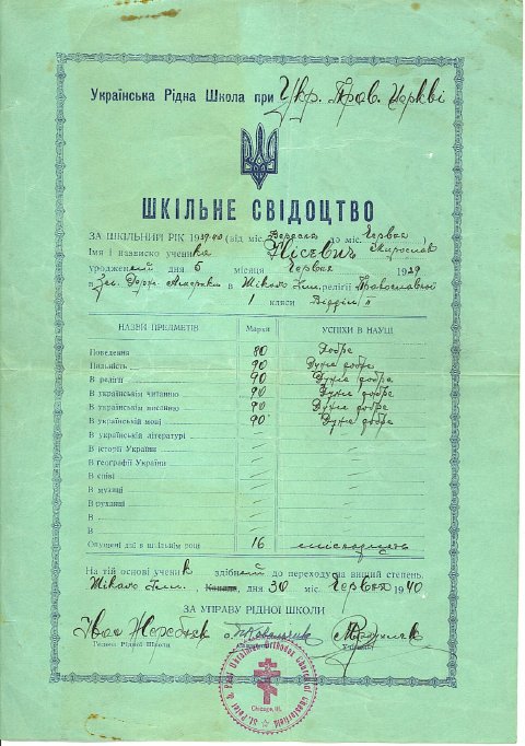 School certificate for Miroslaw Nisiewicz from the Ukrainian National School at the Ukrainian Orthodox Church in Chicago, Illinois